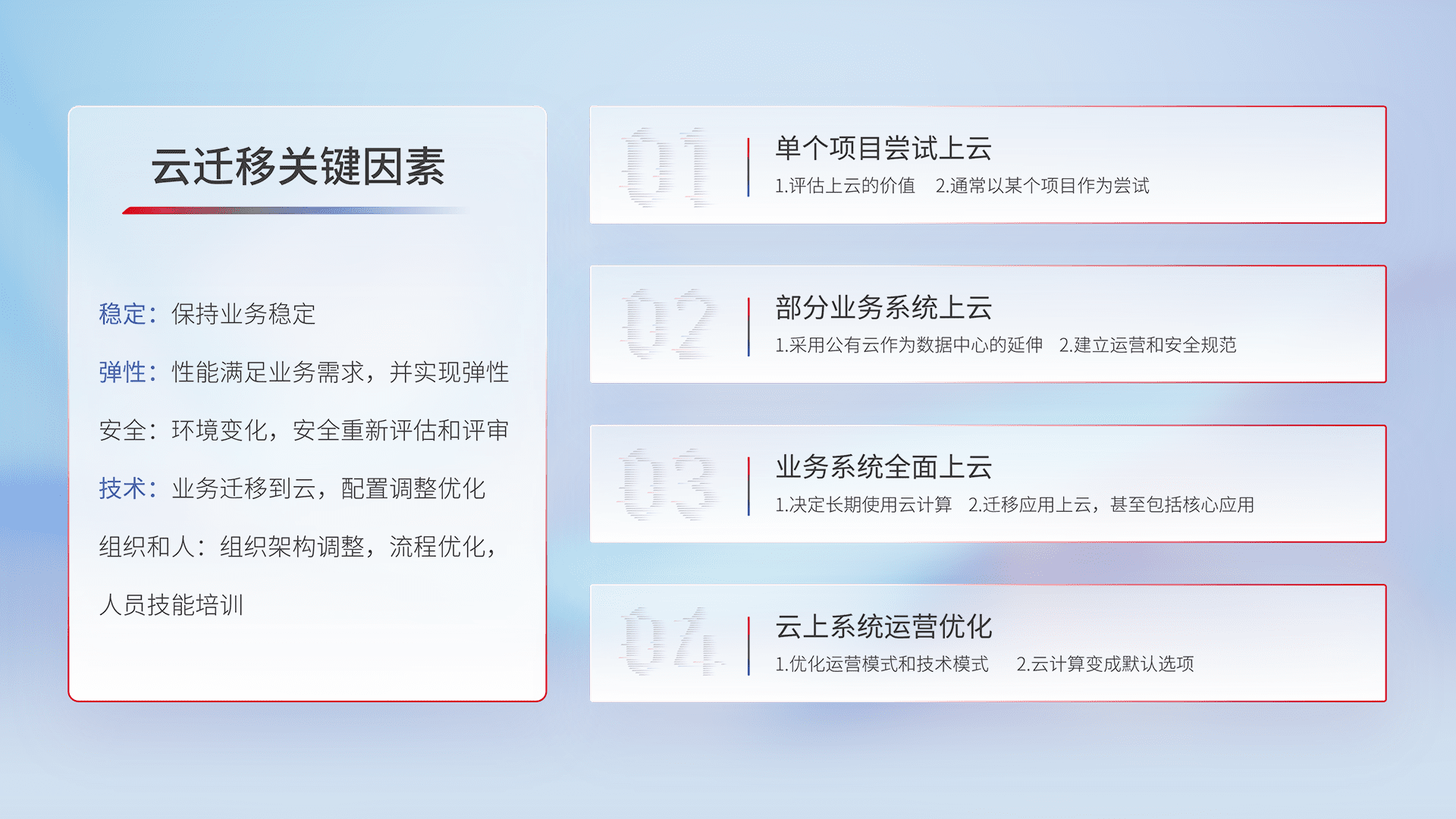 结合实际业务,,,,从规划设计、、云平台选型、、、云原生改造、、、、数据迁移、、、、集成交付,,,迁移全过程为客户识别最佳上云路径,,,做好风险识别管理,,,设计网络架构、、身份权限、、、安全审计合规、、、操作审计、、日志审计、、监控告警策略、、、、多站点容灾设计等,,,,对云上基础设施进行整体规划,,,提升IT治理水平,,,,以满足弹性、、、高可用、、、高性能的需求。。。